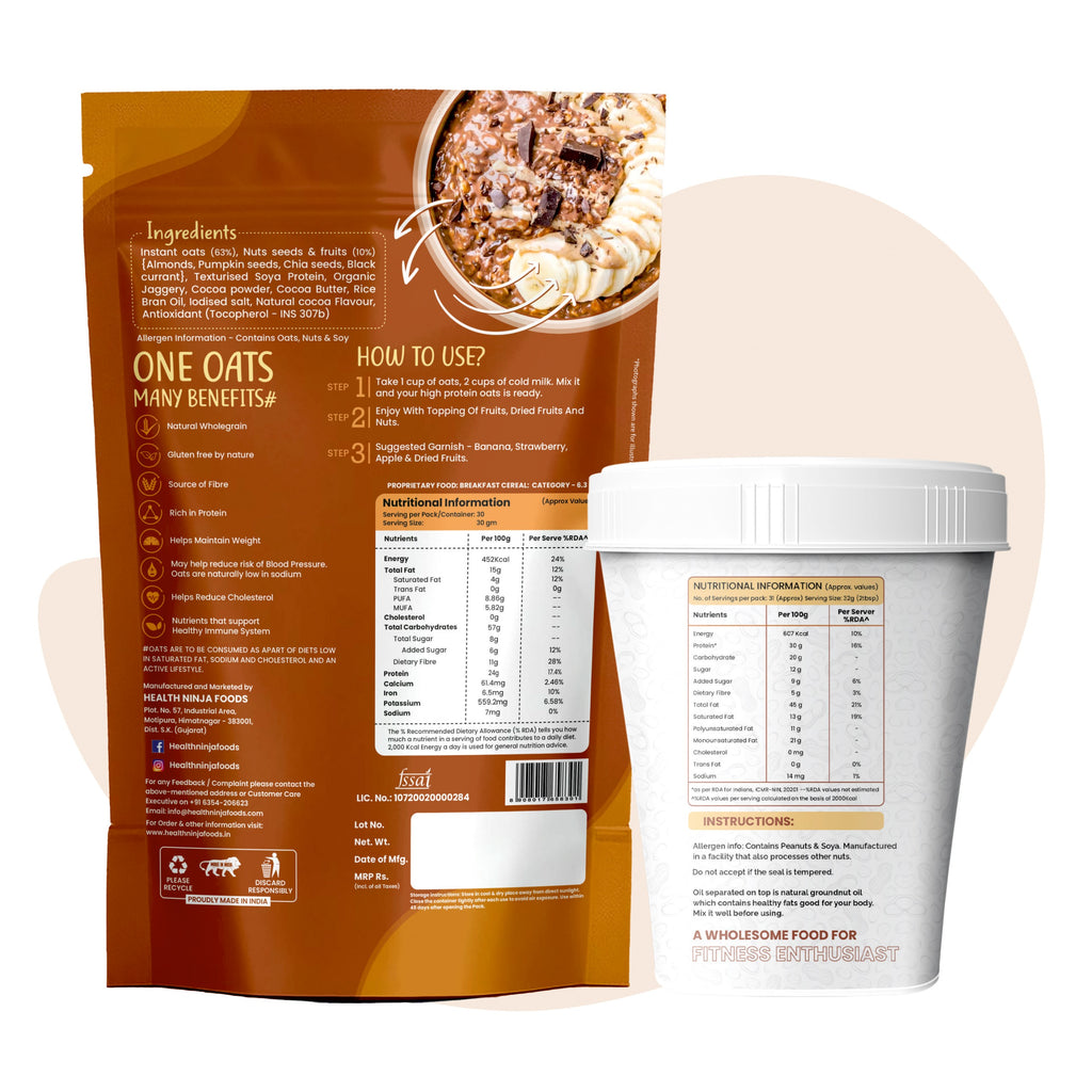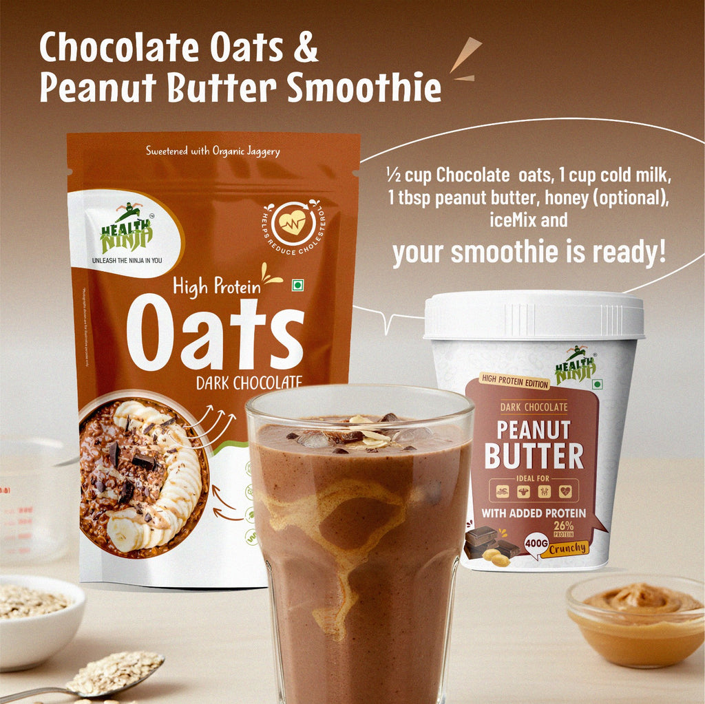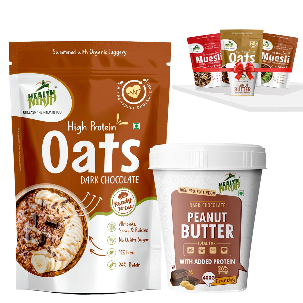 · High Protein Breakfast Combo – Dark Chocolate Oats (900g) & Dark Chocolate Crunchy Peanut Butter (400g) + 4 Sample Packs.